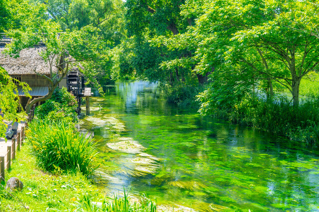 北アルプスの清らかな湧水に育まれた「大王わさび農場」は、安曇野を代表する人気観光スポット。世界最大級のわさび畑が南北約1kmに広がり、無料で散策できるのが魅力です。黒澤明監督の映画『夢』のロケ地・三連水車や大王神社など見どころも豊富。4月下旬〜10月末にはクリアボート体験も楽しめ、わさび丼やわさびソフトなどご当地グルメも充実。新緑が美しい5〜6月は特におすすめです。