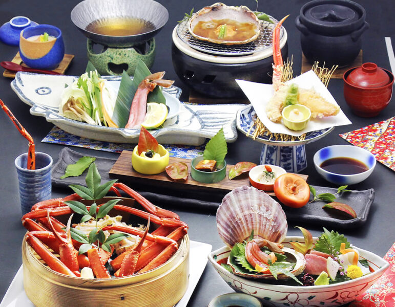 冬の味覚として全国的にも高い人気を誇る「松葉がに」は、島根県が誇る極上の海の幸。その濃厚な甘みと繊細な身のこなしは、まさに冬の贅沢の象徴です。そんな松葉がにを最高の状態で味わえるのが、松江市御手船場町にある「日本料理 松江 和らく」。こちらは完全予約制の高級料亭で、地元食材をふんだんに使った本格日本料理を堪能できる名店です。松葉がに料理では、刺身や焼きがに、甲羅焼き、しゃぶしゃぶなど、さまざまな調理法でその魅力を最大限に引き出しています。中でも、甲羅に蟹味噌と身をたっぷりと詰めて炭火で焼き上げる「甲羅焼き」は絶品。口に入れた瞬間、旨味が一気に広がり、豊かな香りが鼻を抜ける逸品です。美しい中庭を望む個室も完備されており、特別な時間をゆったり過ごしたい方にもおすすめ。島根の冬を満喫するなら、和らくでの松葉がに体験は外せません。