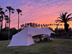 千葉・館山市にある「RECAMP 館山」は、ヤシの木や芝生が彩る南国ムード満点のオアシス。高台のサイトからは海を一望でき、徒歩わずか5分でサーフィンの人気スポット「平砂浦海岸」にアクセス可能という絶好のロケーションです。夕暮れには美しいサンセットに包まれ、夜には波音と満天の星が、心に残る時間を演出してくれます。