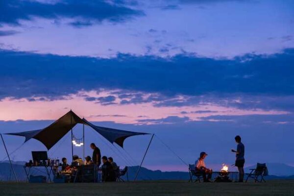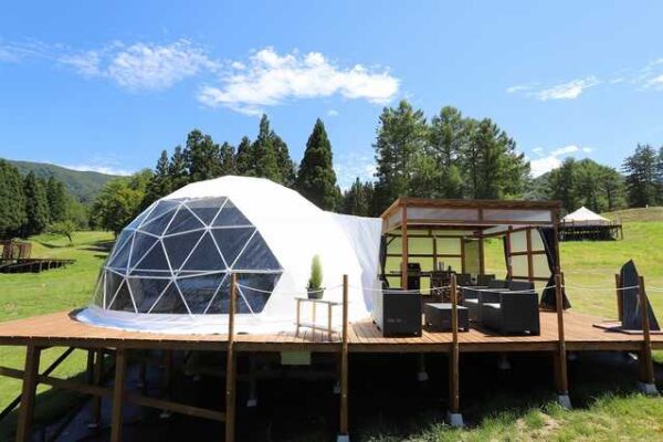 さらに「舞子高原ホテル」が隣接し、温泉大浴場や売店、BBQガーデンなども利用可能。グランピングでは、常設大型テントにファイヤーピットやハンモックを備え、スタッフのサポート付きで贅沢な滞在が叶います。新潟の食材を使った朝食ブッフェや温泉入り放題など、快適なサービスが魅力。自然と快適さを両立した、ファミリーやカップルにもおすすめのキャンプ場です。
