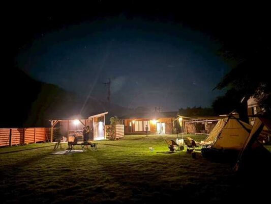 12棟のコテージやバンガローは木のぬくもりを大切にした造りで、キッチンやエアコン、清潔なシャワーやお風呂など快適な設備を完備。初心者でも安心して滞在できるのが魅力です。高台にあるテラスでは見晴らしの良い景色を楽しみながらBBQも可能(要オプション申込)。場内の水道は山水を利用しており、季節や天候で水が濁ることがある点も自然ならではの特色です。自然の中で快適さと非日常を味わえる贅沢なキャンプ体験ができます。
