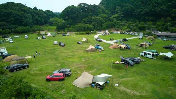 千葉県勝浦市にある「REWILD GREEN FIELD CAMP」は、都内からのアクセスも良く、広大な天然芝のフィールドが広がる開放感あふれるキャンプ場です。ふかふかの芝生の上で裸足で遊んだり、夜は満天の星空を眺めたりと、自然の魅力を存分に楽しめます。