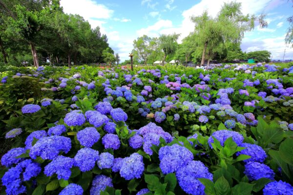 もりやま芦刈園(あしかりえん)は、滋賀県守山市にある四季折々の花を楽しめる庭園です。特に有名なのは約10,000本のあじさいで、日本と西洋の品種がそれぞれ50種類ずつ植栽され、青や白、ピンクなど色とりどりの花が園内を彩ります。見頃は6月後半頃で、梅雨の季節を華やかに演出します。そのほかにも、初夏の花菖蒲やボタン、バラ、さらに秋には可憐に咲くジュウガツザクラなど、多彩な花々が訪れる人々を楽しませてくれます。園内にはスロープや親水河川、芝生広場、多目的広場が整備されており、小さなお子様連れや車椅子の方でも安心して散策可能です。日本庭園と西洋庭園の趣を併せ持つ落ち着いた空間で、自然と触れ合いながらゆったりとしたひとときを過ごすことができる守山市の人気スポットです。