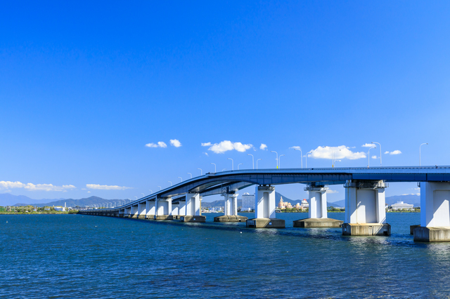 琵琶湖大橋は、守山市と大津市を結ぶ全長1,400mの美しい橋で、琵琶湖観光のシンボル的存在です。全長1,400m、幅6.5m、守山市・大津市に架かる有料橋として建設されたこの橋からは、琵琶湖の雄大なパノラマを一望できます。特に夕暮れ時には琵琶湖に沈む夕日が美しく、ロマンチックな景色を楽しむことができます。また、法定速度内で走ると何と「琵琶湖周航の歌」のメロディーが聞こえてくるという興味深い仕掛けもあり、ドライブの楽しさを倍増させてくれます。橋の両端には展望スポットがあり、記念撮影には絶好のポイントです。守山観光のスタートとして、まずは琵琶湖大橋で琵琶湖の壮大さを感じてみてください。