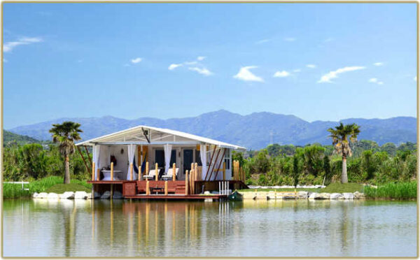 三重県志摩市にある「伊勢志摩エバーグレイズ」は、アメリカンスタイルの上質なグランピングが体験できる人気スポットです。場内には水辺に面したサイトが広がり、カナディアンカヌーに乗ってのんびりと過ごす特別な時間を楽しめます。