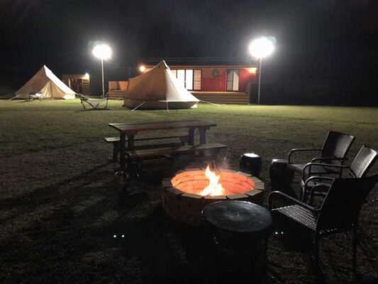 アウトドアリビングでは本格的なアメリカンBBQを堪能でき、心地よい風に吹かれながら非日常のひとときを満喫できます。夜は焚き火を囲んで炎のゆらめきに癒され、極上のリラックスタイムが訪れます。管理棟や売店、温水シャワーやお風呂など設備も整っており、快適に滞在できるのも魅力です。