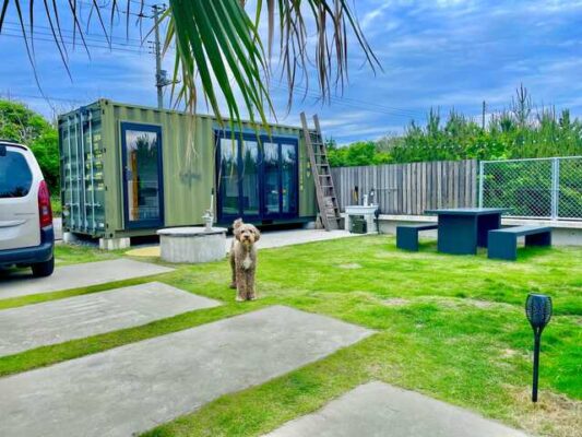 思いのままの過ごし方を見つけられる「UNIUS SEASIDE CAMP」は、一日一組限定の貸切キャンプ場です。40坪ほどとこぢんまりしていますが、周りに他の家が接していないため、プライベート感を悠々に満喫できる特別な空間です。目の前の防風林を抜けたらすぐ海というロケーションで、海で思い切り遊んだり、サップやサーフィンにチャレンジしたり、釣りを楽しんだりできます。宿泊はキャンピングカーやテント泊など自分たちのスタイルで。地元の食材を買ってBBQをする、周辺のごはん屋さんを巡るなど、食事も自由に楽しめます。プロジェクターも常備されているため、夜は外の白い壁に投影して映画鑑賞会なども可能です。誕生日パーティの飾り付けやDJブースを作って仲間内でパーティを開くなど、持ち込みも色々OKで自由にカスタマイズできます。コンテナ内にはわんちゃんも一緒に入ることができ、愛犬と一緒に楽しめるスポットも多い南房総で、自分たちだけの特別な時間を過ごしてみてはいかがでしょうか。