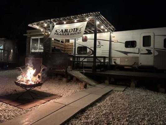 千葉県南房総市にある「カーディフトレーラーハウス」は、一日二組様限定で、トレーラーハウスに泊まってグランピングを楽しめる施設です。キャンプ初心者から上級者まで、快適なアウトドア体験をお楽しみいただけます。施設から徒歩1〜2分で根本海水浴場があり、透き通ったきれいな海には岩場もあるので、海水浴だけでなく磯遊びも楽しめます。白い砂浜からは大島や新島などの伊豆七島が一望できる最高のロケーションです。ヴィンテージのエアストリームとマラード、タイプが違う二台のトレーラーハウスはエアコン完備で、近くには24時間利用可能なお風呂(バスタブ付き)、ウォシュレット付きトイレ、炊事場があり、他グループを気にせず利用できます。ウッドデッキには屋根があるので、雨が降ってもBBQを楽しめます。全てのプランにBBQ道具を無料で貸し出しているため手ぶらでOK。きれいな海と満天の星空、冬には焚き火も楽しめる南房総の当施設で、最高のロケーションをお楽しみください。