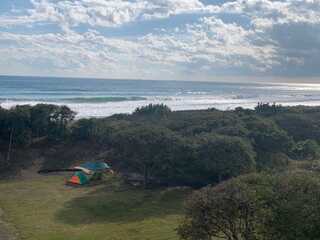 千葉県南房総市にある「SOUTH BIRD INN-LK Boyz, Chitose Beach Surf Camp」は、海まで数歩という立地の小さなキャンプ場です。冬でも暖かい南房総の外房地区、千歳ビーチ(三島海岸)に面しており、波の音をBGMにビーチキャンプを楽しめます。サイトは砂浜より低い位置にあるため海は見えませんが、自然のままのローカルビーチの波音が常時伝わってきます。芝生と大きな木を残したキャンプエリアは、海外のBeach Parkのようなイメージで、テント間の距離も保たれておりプライベート感があります。朝は水平線から日の出が見える絶景タイムがあり、晴れた日には浜辺に出て流木に腰を下ろして水平線を眺める癒やしの時間を過ごせます。サーフショップを併設し、サーフボードやウエットスーツのレンタル、サーフィン体験も可能で、サーフキャンプにも最適。釣りシーズンには活気があり、普段はとても静かな浜辺を独占できることも珍しくありません。館山・鴨川方面へのアクセスも良い南房総で、海と空のパワーを感じる特別な滞在を楽しめます。