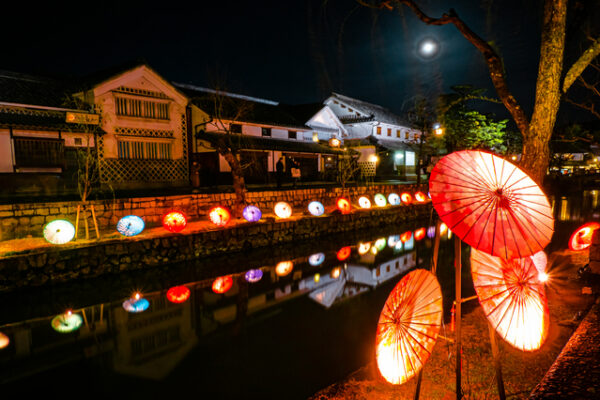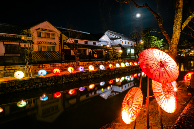 午後の観光を終えたら、夕方は「倉敷美観地区」へ。白壁の蔵屋敷やなまこ壁、柳並木が連なる町並みは情緒豊かで、まるで時代をタイムスリップしたかのような雰囲気を味わえます。レトロとモダンが融合した景観は、国内外から訪れる人々を魅了し続けており、散策するだけで心が落ち着く特別な時間となるでしょう。倉敷川沿いを歩けば、水面に映る建物や灯籠が美しく、写真スポットとしても人気です。夕暮れ時には町並みが柔らかな光に包まれ、昼間とは違った幻想的な表情を見せてくれるのも魅力。点灯された街灯や照明が景観を引き立て、歩くだけで映画のワンシーンのような気分に浸れます。伝統建築と現代的な演出が織りなす美観地区の夕暮れ散策は、旅の1日を締めくくるのにぴったりの贅沢なひとときです。