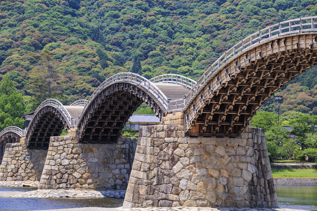 瑠璃光寺から車で約50分、山口観光の最後を飾るのは岩国市の錦帯橋です。錦川に架かる五連の木造アーチ橋は、日本三名橋の一つに数えられる山口の誇る伝統建築。1673年に創建された錦帯橋は、釘を一本も使わない伝統工法で組み上げられた芸術作品のような美しさです。橋の上を歩くと、木の温もりと職人技の素晴らしさを実感できます。錦帯橋の周辺には、岩国城や吉香公園などの観光スポットも点在しており、時間に余裕があれば散策するのもおすすめ。特に岩国城へ向かうロープウェイからの眺めは絶景で、錦帯橋と岩国の街並みを一望できます。錦川河川敷では、名物の岩国寿司やソフトクリームを販売する店も並び、休憩しながら景色を楽しむのも良いでしょう。山口2泊3日の旅の最後に、日本の伝統美を堪能してください。