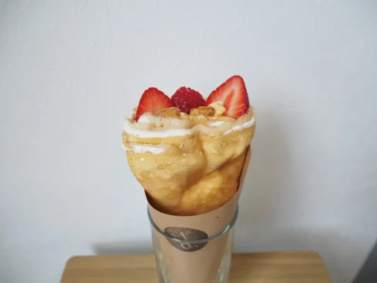 山口市の中心部、JR山口駅から徒歩圏内にある人気のカフェです。白を基調とした洗練されたおしゃれな空間で、美味しいスイーツやクレープが楽しめます。注文を受けてから一枚一枚丁寧に焼き上げるクレープは、もちもちとした生地が特徴。旬のフルーツを使ったものや、いちごとバナナのチョコクレープなど、魅力的なメニューが揃います。また、表面をパリパリにキャラメリゼしたブリュレも、濃厚な味わいで人気の逸品です。洗練された居心地の良い雰囲気で、InstagramなどSNSでも話題のお店。テイクアウトも可能で、街歩きの途中に気軽に立ち寄れるのも嬉しいポイントです。