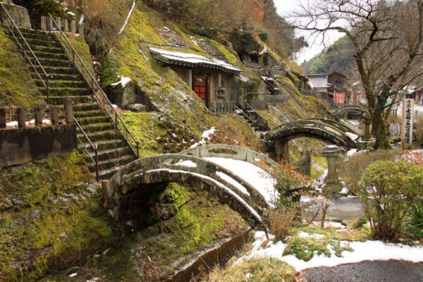 夕方は石見銀山観光の仕上げとして、歴史と自然が感じられるスポットを巡りましょう。まず訪れたいのが「羅漢寺五百羅漢」。石造りの反り橋を渡った先の岩山に、500体もの羅漢像が並び、鉱山で働いた人々の魂を慰める場所として知られています。昔から「橋を渡った先は浄土」と言われ、亡き親や大切な人に再び会えると信じられてきました。厳かな雰囲気に包まれるこの地で、静かに手を合わせれば、旅の疲れも癒されるでしょう。