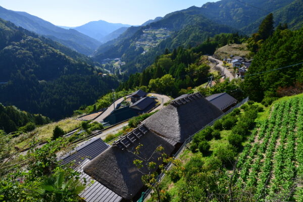 2日目の朝は、国選定重要伝統的建造物群保存地区に指定されている「落合集落」を訪れてみましょう。標高差約390mもの急斜面に築かれた集落は、日本でも有数の険しい地形に形成された山村で、江戸時代中期から昭和初期にかけて建てられた家屋や石垣、畑が残り、昔ながらの生活の痕跡を色濃く伝えています。訪れると、まるで時間が止まったかのような懐かしい風景が広がり、山里の人々の知恵と工夫を実感できます。向かいの「落合集落展望所」からは、集落全体を一望でき、季節によっては一面に咲くそばの花が彩りを添えてくれるのも魅力。徳島の原風景に出会える落合集落で、静かな朝のひとときを楽しみましょう。
