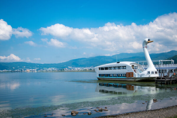 午後の街歩きを楽しんだあとは、松本から少し足を延ばして諏訪湖エリアへ。まずは「諏訪湖遊覧船」に乗って湖上クルーズを体験しましょう。白鳥型の「すわん」や新型の遊覧船に乗り込み、湖面をゆったり進みながら四季折々の風景を満喫できます。夏は湖上花火、冬はワカサギ釣りと、季節ごとの楽しみも豊富。湖上から眺める山並みや街の風景は、陸地からでは味わえない特別な景観です。