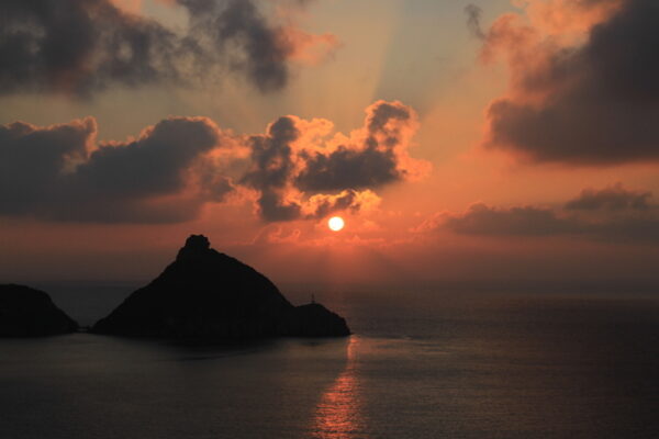 午後のグルメやショッピングを楽しんだ後は、奈摩湾入口に位置する「矢堅目公園」へ。ここは東シナ海を一望できる展望スポットとして知られ、訪れる人々を圧倒する雄大な景観が広がります。園内から見渡すオーシャンビューはどこまでも広がり、海に浮かぶ円錐形の巨岩がシンボルのようにそびえ立つ姿は、まさに五島ならではの絶景。特に夕暮れ時には、空と海がオレンジ色に染まり、巨岩のシルエットがくっきりと浮かび上がる光景が広がります。幻想的な雰囲気に包まれたその美しさは、時間を忘れて眺めたくなるほど。複雑に入り組んだ海岸線や奇岩の造形美も加わり、ここでしか体験できない感動的な夕景に出会えるでしょう。カメラを片手に訪れる人も多く、五島の自然の迫力とロマンを堪能できる特別な時間が過ごせます。