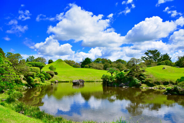 熊本城を見学したあとは、熊本市内にある「水前寺成趣園」へ向かいましょう。江戸初期に肥後細川家初代藩主・忠利公が御茶屋を建てたことが始まりとされる回遊式庭園で、国の名勝・史跡にも指定されています。阿蘇の伏流水が湧き出る園内には池や築山があり、四季折々の花木とともに優雅な散策が楽しめます。特に春には桜が咲き誇り、多くの花見客でにぎわうスポットです。