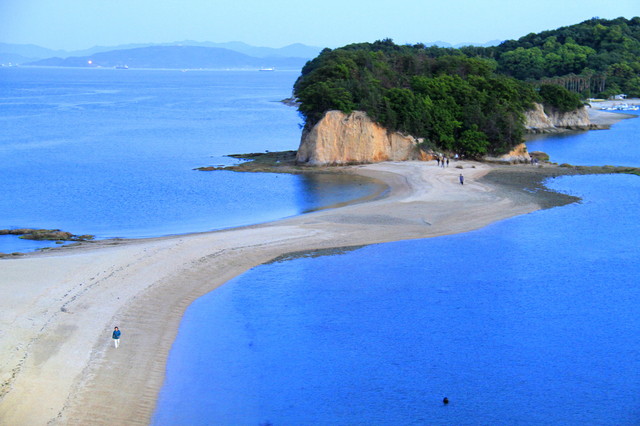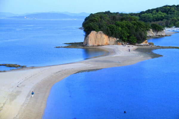 午後のサイクリングの締めくくりには、小豆島を代表する絶景スポット「エンジェルロード」へ向かいましょう。潮の満ち引きによって現れたり消えたりする砂の道は、干潮の時間帯だけ姿を見せる神秘的な景観。大切な人と手をつないで渡ると願いが叶うといわれ、カップルや家族連れに大人気の開運スポットです。