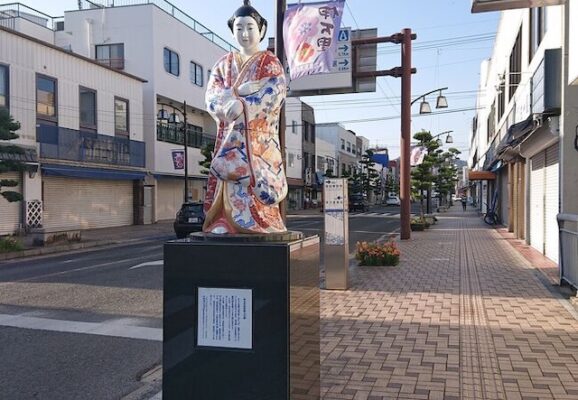 旅の締めくくりには、伊万里の商店街をゆったりと散策してみましょう。入口で迎えてくれるのは、陶磁器で作られた高さ2mを超える「古伊万里美人像」。その存在感ある姿は、焼き物の町ならではのフォトスポットです。