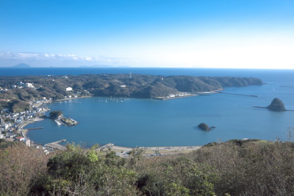 下田観光のスタートは「寝姿山自然公園」から始めましょう。伊豆急下田駅からロープウェイに乗り、わずか3分で山頂へ。そこからは下田湾の美しい入り江や伊豆七島の島影を一望できる大パノラマが広がります。その稜線が女性が横たわる姿に見えることから「寝姿山」と名付けられたこの地は、古くから人々に親しまれてきました。