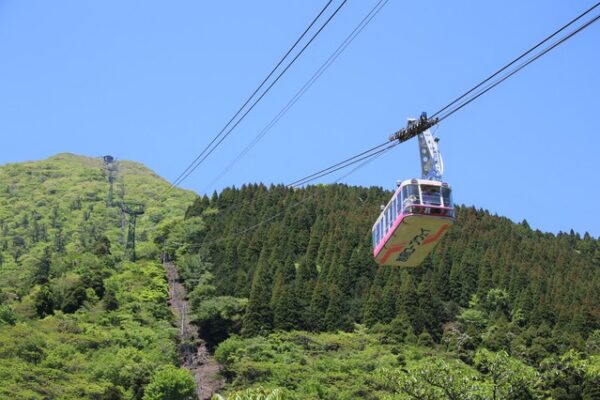午後の観光を終えたら、夕方は「別府ロープウェイ」に乗って雄大な景色を堪能しましょう。九州最大級、101人乗りのロープウェイは山上まで一気に運んでくれ、別府市街や別府湾、さらにはくじゅう連山まで一望できます。