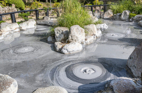 午後は「鬼石坊主地獄」と「かまど地獄」へ足を運びましょう。鬼石坊主地獄は、灰色の熱泥がボコボコと球状に浮かび上がる様子が坊主頭のように見えることから名付けられたスポット。733年に編纂された『豊後国風土記』にも登場するほど古い歴史を持ち、一度閉鎖された後に2002年に再オープンしました。地底から湧き出る熱泥の迫力は、自然の力を直に感じさせてくれます。