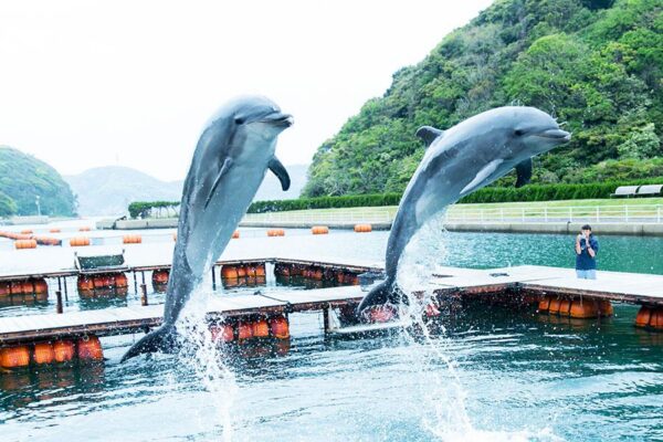 午後は壱岐島北部にある人気スポット「壱岐イルカパーク&リゾート」へ。天然の入り江を活かした海浜公園で、可愛いイルカたちと触れ合える癒しの体験が楽しめます。「イルカに間近でタッチできる」「イルカにごはんをあげられる」などのプログラムがあり、家族連れやカップルにも大人気。のびのびと泳ぐイルカの姿に心が癒されるひとときを過ごせます。