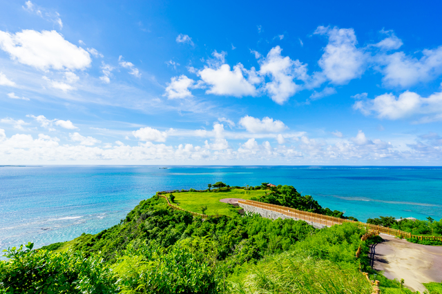 旅の締めくくりは、南城市にある「知念岬公園」へ。海にせり出した岬に位置し、展望台からはエメラルドグリーンからコバルトブルーへと変化する美しい海のグラデーションが一望できます。晴れた日には、久高島や無人島・クマカ島を遠くに望み、まさに“神の島を見渡す絶景スポット”。