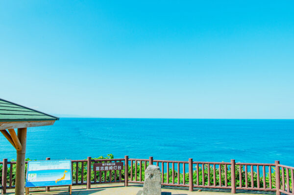 午後の観光を終えたら、種子島の最北端に位置する「喜志鹿崎灯台」へ。白い灯台が青空と海に映えるこの場所は、島の中でも特に静かで、自然の雄大さを肌で感じられる絶景スポットです。本土最南端の佐多岬と向かい合う位置にあり、その海域は「大隅海峡」と呼ばれ、国際海峡に指定されているほどの重要な航路。