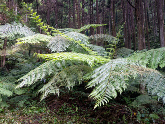 旅のスタートは、西之表市にある「ヘゴ自生群落」へ。ここは亜熱帯性のシダ植物・ヘゴが群生する神秘的な森で、南国ムード満点の自然に包まれた人気スポットです。杉や竹の林に囲まれた小道の両脇には、背の高いヘゴが生い茂り、まるで映画のワンシーンのような光景が広がります。