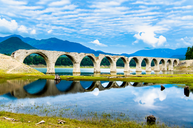 午後のドライブを楽しんだあとは、季節によって姿を変えることで知られる「タウシュベツ川橋梁」へ。糠平湖(ぬかびらこ)の湖面に現れるアーチ型の橋で、北海道遺産にも登録されています。冬には凍結した湖上にその姿を現し、夏には水位上昇により湖底へと沈んでいくことから“幻の橋”と呼ばれる神秘的なスポット。古代ローマの水道橋を思わせる美しいアーチが並び、四季ごとに異なる表情を見せてくれます。