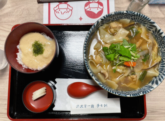 見学のあとは、すぐ隣の「麺屋忠兵衛 煮ぼうとう店」でランチタイム。地元野菜をたっぷり使った熱々の煮ぼうとうは、渋沢栄一が愛した郷土料理。素朴ながらも滋味深い味わいで、旅の疲れを癒してくれます。古民家風の落ち着いた空間で、深谷らしいぬくもりを感じながらゆったりと食事を楽しみましょう。