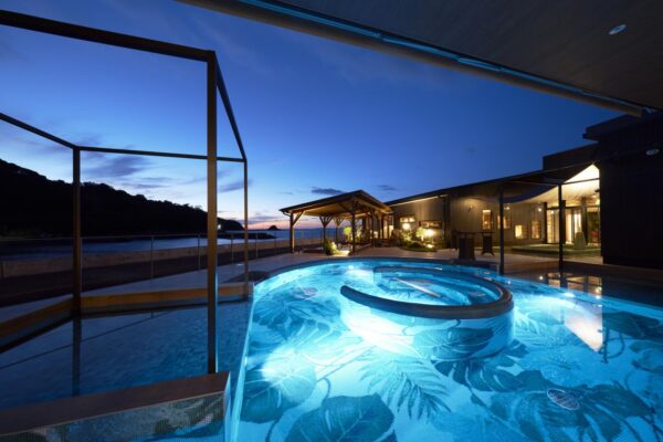1日の締めくくりは、九州最大級のスパテーマパーク「Ark Land Spa」へ。屋内には森の中にいるような雰囲気の「ボタニカルサークルスパ」や歩行浴を楽しめる「ウェルネスウォーキングスパ」など、多彩なスパエリアが充実。屋外では、海を眺めながら入れるインフィニティ寝湯や天然温泉の岩風呂もあり、旅の疲れをじっくり癒すことができます。