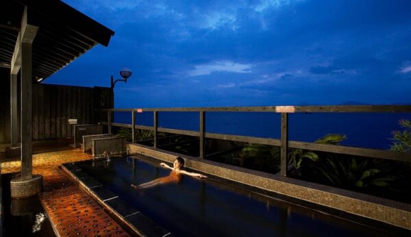 夕方:天然温泉ユユスパで海を眺めながら癒しの湯浴み