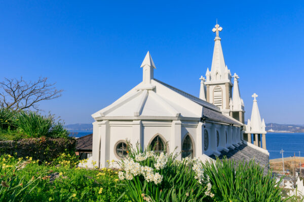 午後は、伊王島(沖之島)を代表する歴史的建造物「カトリック馬込教会」へ。白亜のゴシック様式が美しいこの教会は、キリシタン迫害を逃れた信者たちが信仰を守り抜くために建てたもので、今も島民の多くがカトリック信徒として教会を大切に守り続けています。高台に建つ教会からは、紺碧の海と白い壁のコントラストが映え、晴れた日には遠く五島列島まで望める絶景スポット。教会の静けさと潮風が心を落ち着かせてくれます。