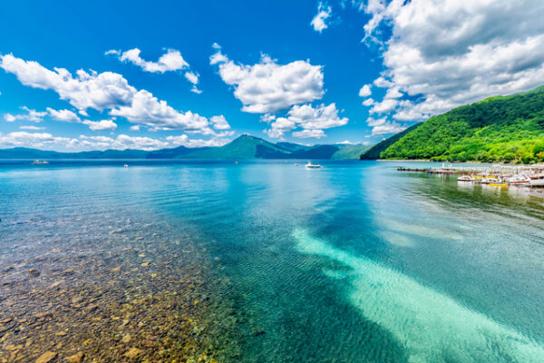 北海道の旅のスタートは、札幌から車で約1時間の場所にある「支笏湖」へ。日本有数の透明度を誇るカルデラ湖で、湖面は驚くほど澄み渡り、天候によってエメラルドグリーンやコバルトブルーに輝きます。湖畔を歩くだけでも、心が洗われるような静けさと爽やかな風に包まれ、非日常の癒しを感じられます。