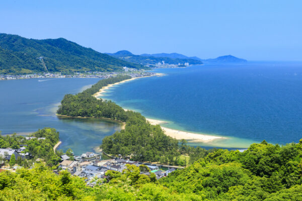 京都北部の旅は、日本三景のひとつ「天橋立」からスタート。宮津湾に伸びる約3.6kmの砂州に約6,700本の松が生い茂り、まるで天へと続く橋のように見えるその光景は圧巻です。天橋立ビューランドや傘松公園からは有名な「股のぞき」ポーズで絶景を望むことができ、海と空が逆転したような不思議な眺めを楽しめます。