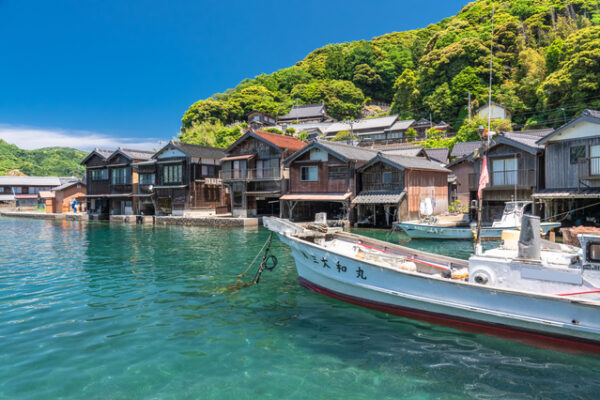 午後は、京都北部を代表する港町「伊根の舟屋」へ。海に面して立ち並ぶ約230軒の舟屋は、1階が船のガレージ、2階が住居という独特の造りで、海とともに生きる人々の暮らしを感じられます。青く澄んだ海に家々が映り込む光景はまるで絵画のようで、静かな漁村の風情に心が癒される人気スポットです。