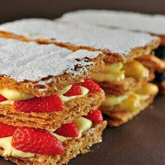 松阪市新町に位置する、レンガ造りのかわいらしい外観が目を引くスイーツ専門店です。オープンから25年以上、地元で愛され続けているこちらのお店の看板商品は、「賞味期限1時間以内」という独自のミルフィーユ。1日かけて丁寧に作られたパート生地を、翌日6時間かけて折り上げたフィタージュは、サクサクの食感が絶品です。時間が経つとこだわりの生地のサクサク感が失われてしまうため、できればお店のカフェスペースでいただくのがおすすめ。ショーケースには毎朝35種類以上の生菓子が並び、旬の素材を使った期間限定商品も充実しています。また、松阪出身の本居宣長にちなんだ「松阪鈴菓」や、地元のお米の米粉を使用した「白米城物語」など、松阪らしい焼き菓子も人気。ブルーベリーの自社農園を持ち、フルーツから育てたこだわりのタルトなども楽しめる、松阪を代表するスイーツ店です。