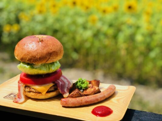 富良野牧場内に佇むフラノバーガーは、富良野の雄大な景色を眺めながら手作りハンバーガーを味わえる人気店です。富良野産ポーク100%のパティは肉汁たっぷりでジューシーな味わいが自慢で、ふわふわのバンズや新鮮な野菜も富良野産の素材を使用しています。店舗前に広がる開放的なテラス席は40席あり、北の大地の風を感じながらゆったりと食事を楽しめます。人気メニューのふらのチーズバーガープレートは、富良野チーズをたっぷり使った贅沢な一品。テイクアウトも可能なので、鳥沼公園などでのピクニックランチにもおすすめです。食べログハンバーガー百名店にも選出される実力派のお店です。
