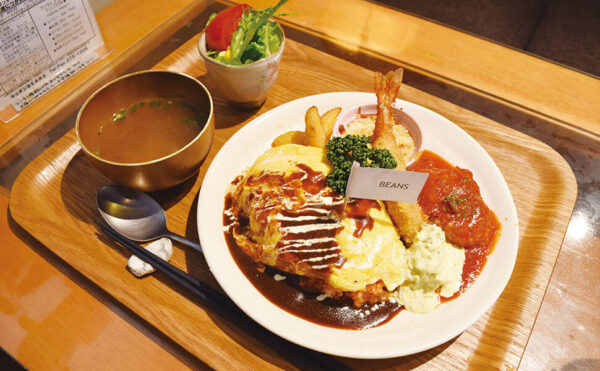 看板メニューの「若鶏と湯葉の和風あんかけオムライス」は、ふわとろ卵にだしの効いた優しいあんをかけた上品な味わい。湯葉のまろやかさと鶏肉の旨みが絶妙に調和し、どこか懐かしさを感じる人気の一皿です。