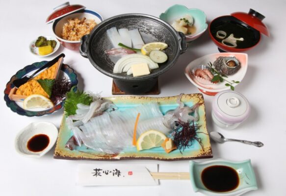 「萩心海」は、東 萩駅から徒歩約5分という好立地に佇む活魚料理の名店で、店名にふさわしく大きな生簀を備え、注文後に料理する鮮度抜群の海鮮が自慢です。特に、丸ごとのけんさきイカを刺身・天ぷら・塩焼きで味わう「イカ活造り」や、板ウニ・ヒラメ・アワビなど旬の魚介を使った定食は旅情を高める逸品。地元ならではの素材を洗練された和の数々に仕立てており、観光の合間のランチや記念日ランチにもおすすめです。店内は座敷・テーブル席を備え、駐車場も完備されているため、家族連れからカップル、ひとり旅の方まで幅広く利用しやすい雰囲気。城下町・萩で“旬の海の幸”を余すところなく楽しみたいときに、ぜひ訪れたい一軒です。