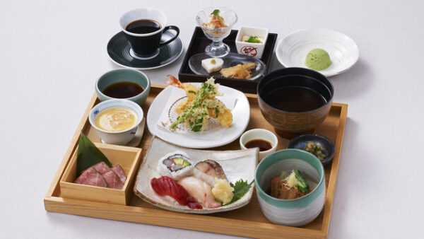 ランチでは、天ぷらや刺身、小鉢などが並ぶ「そばセット」や「かつ煮御膳」などの御膳メニューのほか、特別な日に人気の「犀川御膳」も用意。旬の素材を活かした一品一品が美しく盛り付けられ、記念日ランチにもおすすめです。