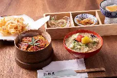 秩父産のそば粉を使用した香り高いそばを中心に、松村牧場の「香り豚」を使ったわらじカツ丼など、秩父らしい味覚が並びます。人気の「Manpuku御膳」は、そばとわらじカツ丼、自家製ぬか漬け、薬味などがセットになった贅沢な一品。ゴマだれ、味噌、ポン酢、塩の4種の味付けで楽しめるスタイルも魅力です。