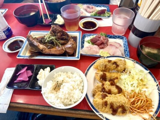 新鮮な魚介が自慢で、刺身や活イカ、伊勢海老の浜焼きなど海の幸をふんだんに使った料理がそろいます。特に「アラ煮定食」は濃厚な旨味が評判の人気メニュー。