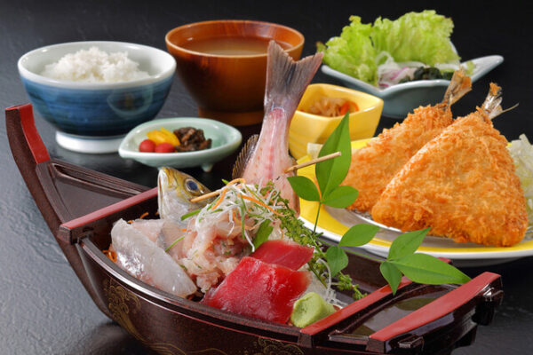 そば・うどん・カレーといった定番メニューのほか、地元の鮮魚を使った刺身定食や海鮮丼も人気。特に「鯨カツ定食」や「鳥天定食」など、館山ならではの個性的な料理がそろい、どれもボリューム満点です。