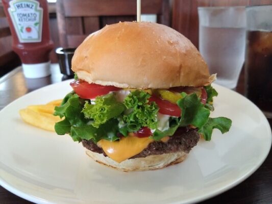 看板メニューのハンバーガーは、プレミアムビーフ100%使用のパテを香ばしく焼き上げた一品。ジューシーな肉の旨味とシャキシャキのレタスやピクルスがバランスよく、シンプルながら満足感のある味わいです。チーズバーガーやベーコンバーガー、パイナップルバーガーなどバリエーションも豊富。