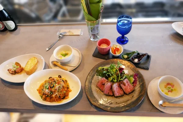 ランチは「パスタセット」や「ドリアセット」が人気で、どちらも前菜・パン・デザート・ドリンク付き。サラダや前菜はボリュームがあり、素材の新鮮さを活かした味わいが好評です。