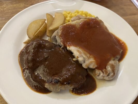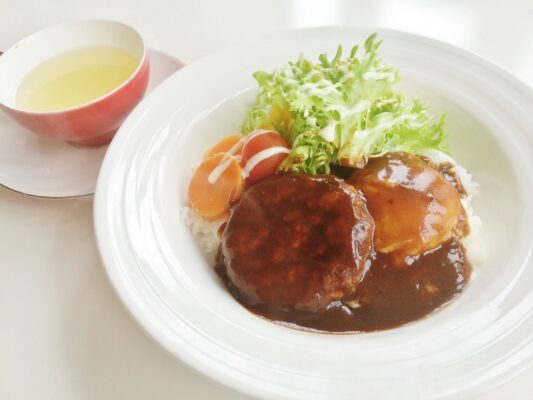 メニューには、ハンバーグ・オムライス・ナポリタンなど定番の洋食が並び、どのセットにもサラダと味噌汁が付く嬉しい内容。エビフライやチーズハンバーグなどの組み合わせ定食もあり、しっかり食べたい方にもおすすめです。
