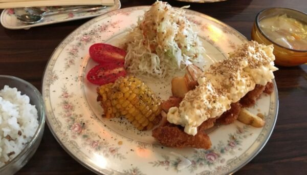 ランチでは「チキンカツのタルタルソース定食」や「キノコとブロッコリーのクリームスープパスタ」など、洋食をベースにしたバリエーション豊富なメニューが並びます。特にサクッと揚がったチキンカツはボリュームもあり、満足感の高い一品として人気。